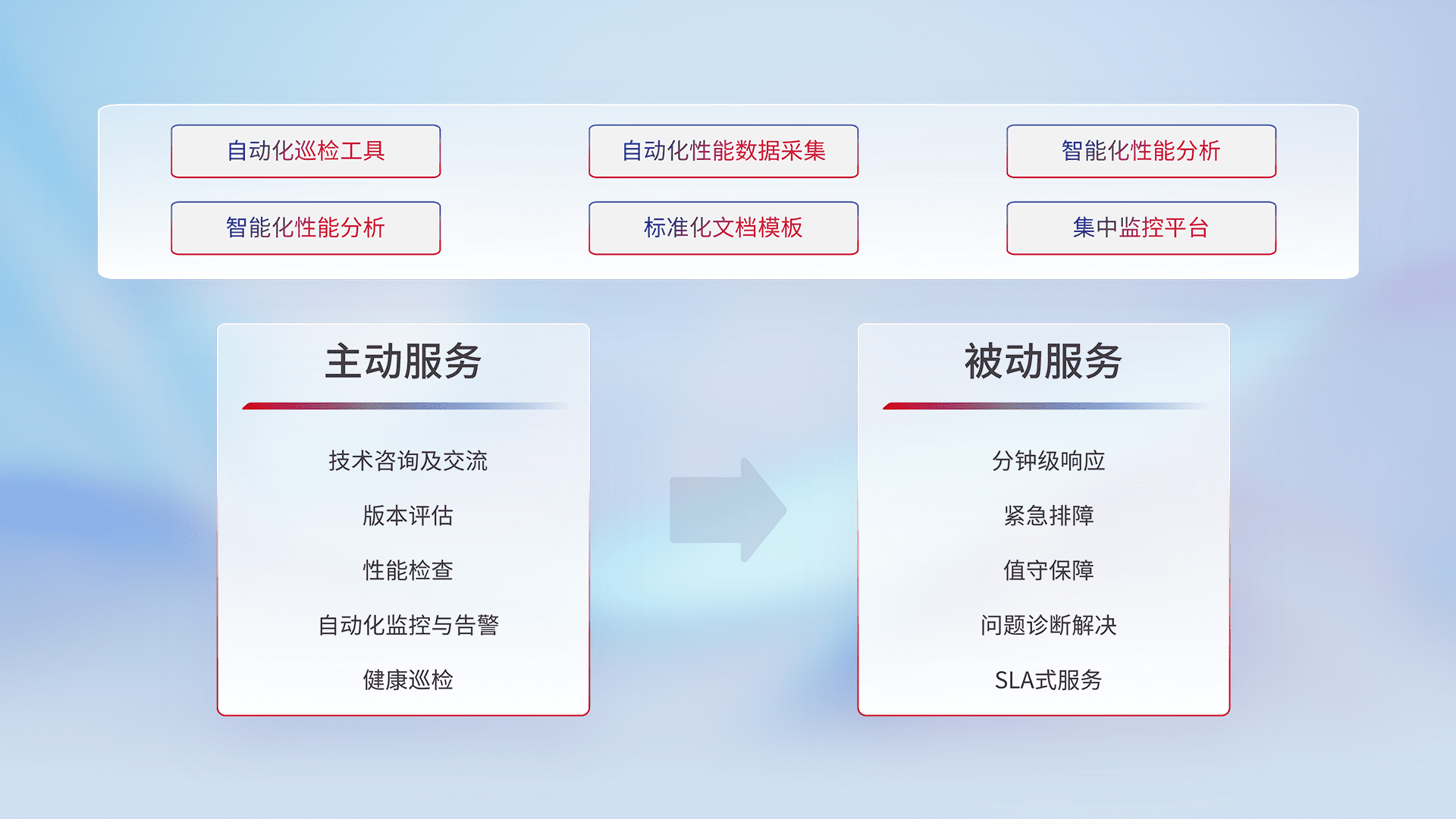 智能化工具和标准化文档,,,,保障服务质量,,提供主动服务(包含技术咨询、、、版本评估、、性能检查、、、自动化监控与告警、、健康巡检)和被动服务包含(分钟级响应、、、、紧急排障、、、值守保障、、问题诊断解决、、SLA服务)。。